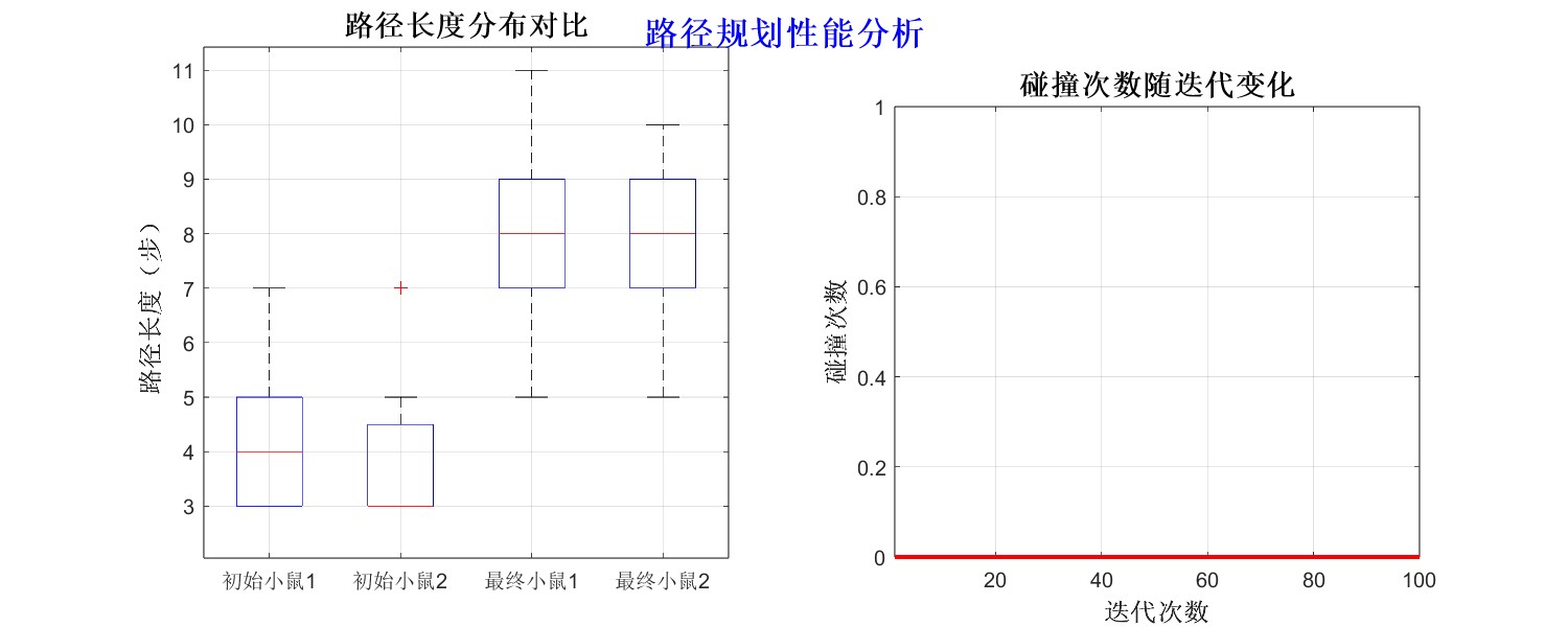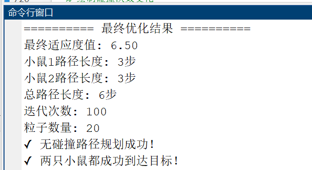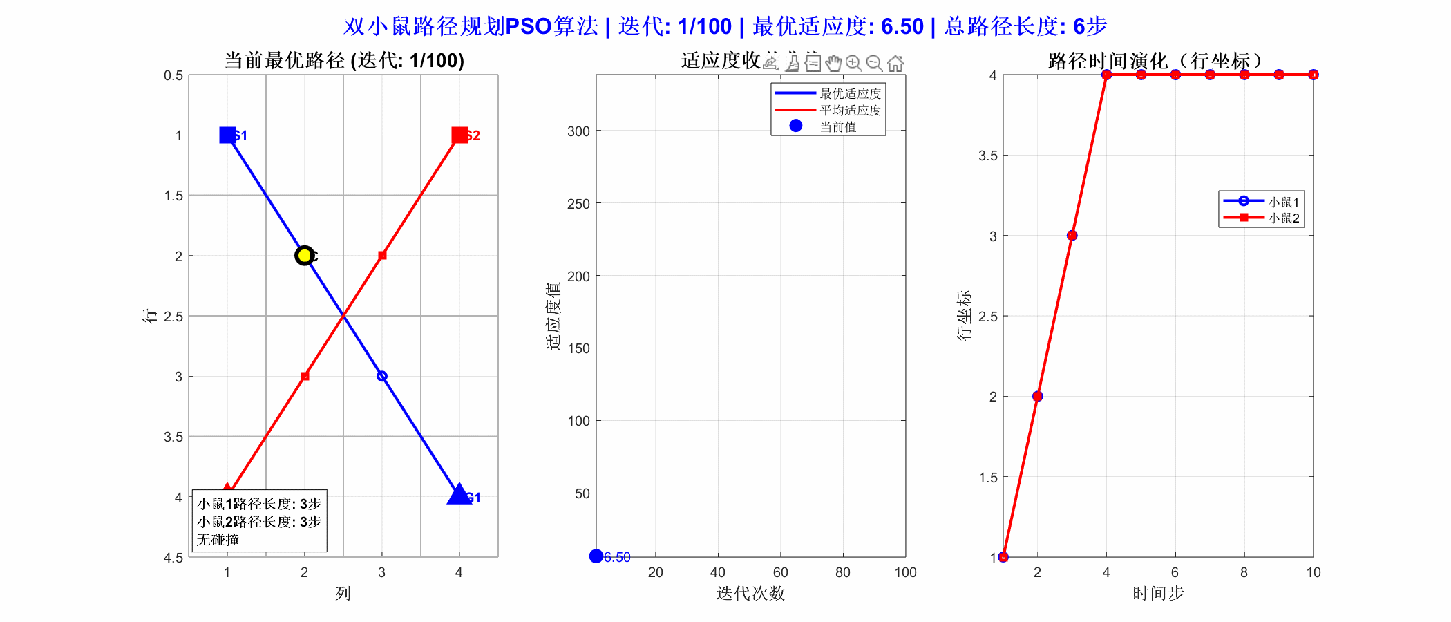 - 粒子表示:每个粒子表示一个完整的路径方案,即两只小鼠的路径序列组合。位置编码为离散的网格坐标序列,速度表示为位置调整的概率向量。