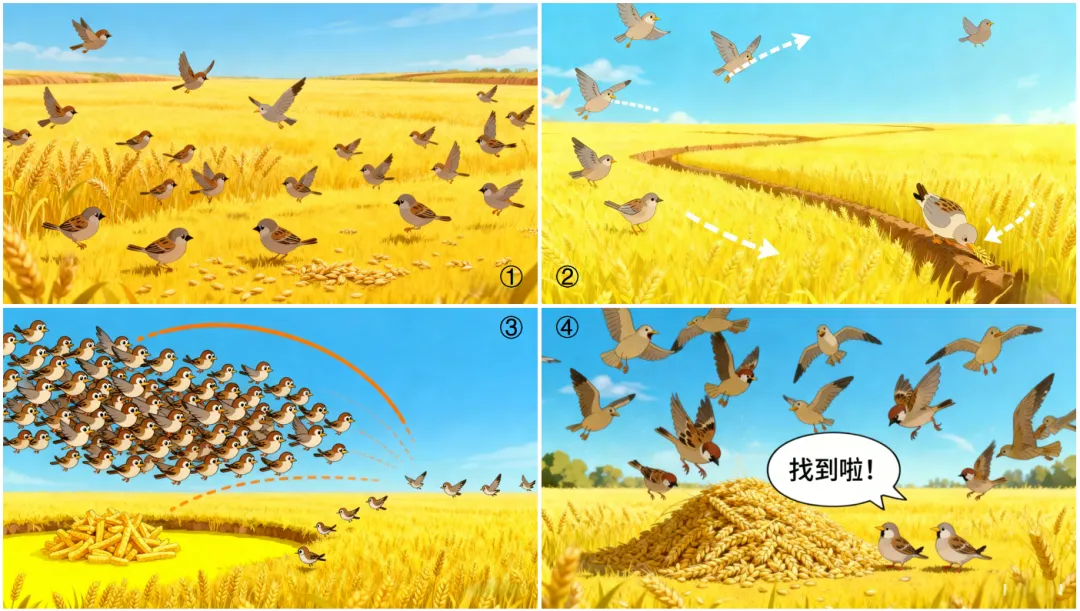 - 最终结果:起初,麻雀群四散纷飞,一片混乱。但很快,通过这种持续分享"我见过的最好地点"的简单规则,一些原本在边缘的麻雀开始被"吸引"到更有希望的区域。