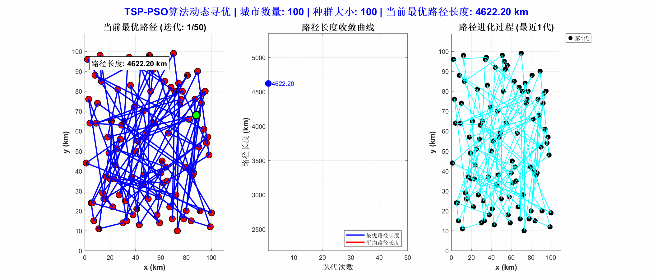 - 初始化:随机生成多个合法路径作为粒子初始位置,速度初始化为零或小随机交换序。
