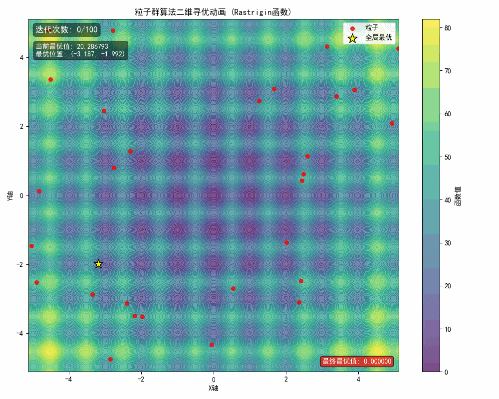 - 更新策略:速度和位置更新使用二维扩展公式,确保每个维度独立更新;位置约束通过边界处理实现,防止粒子飞出定义域。