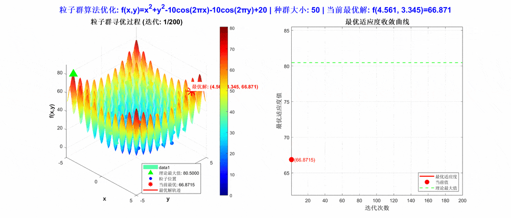 从运行结果可以看出,算法在定义域内成功定位到全局最大值点(4.530,-4.516),最大值为80.686。图像显示粒子在二维空间中逐渐向最优区域聚集,验证了PSO算法在高维非线性函数优化中的有效性。其社会学习机制使粒子能协同探索复杂解空间,适用于多参数优化、机器学习超参数调优等问题。