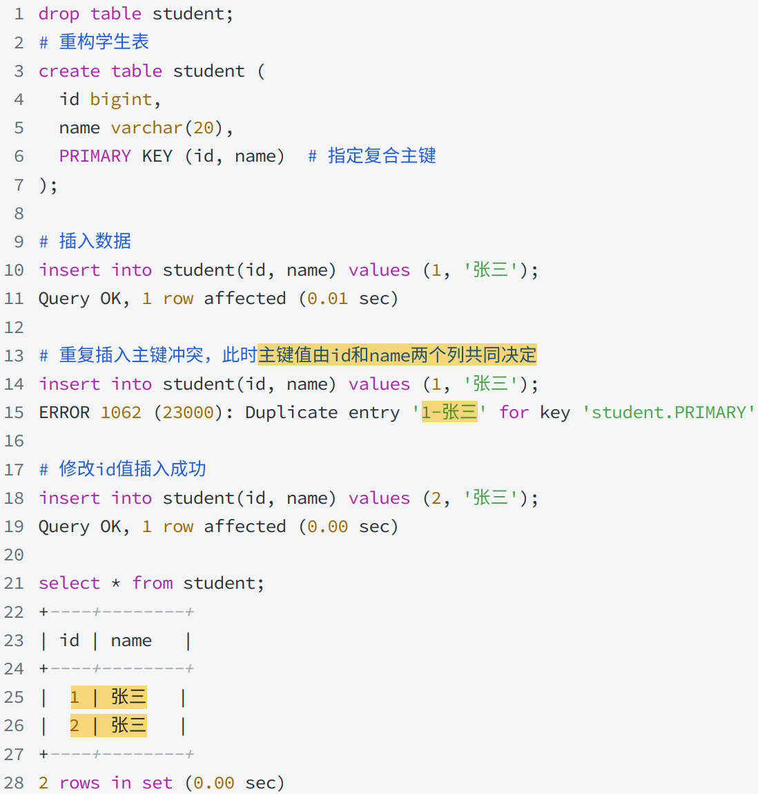 • 复合主键,由多个列共同组成的主键 ,主键是否冲突 以多个列的组成进行判定。
