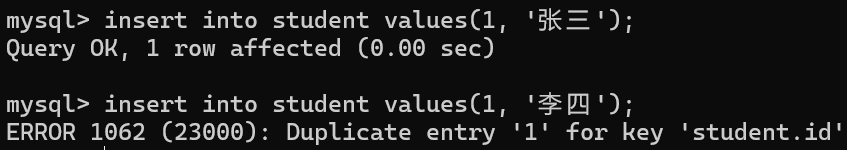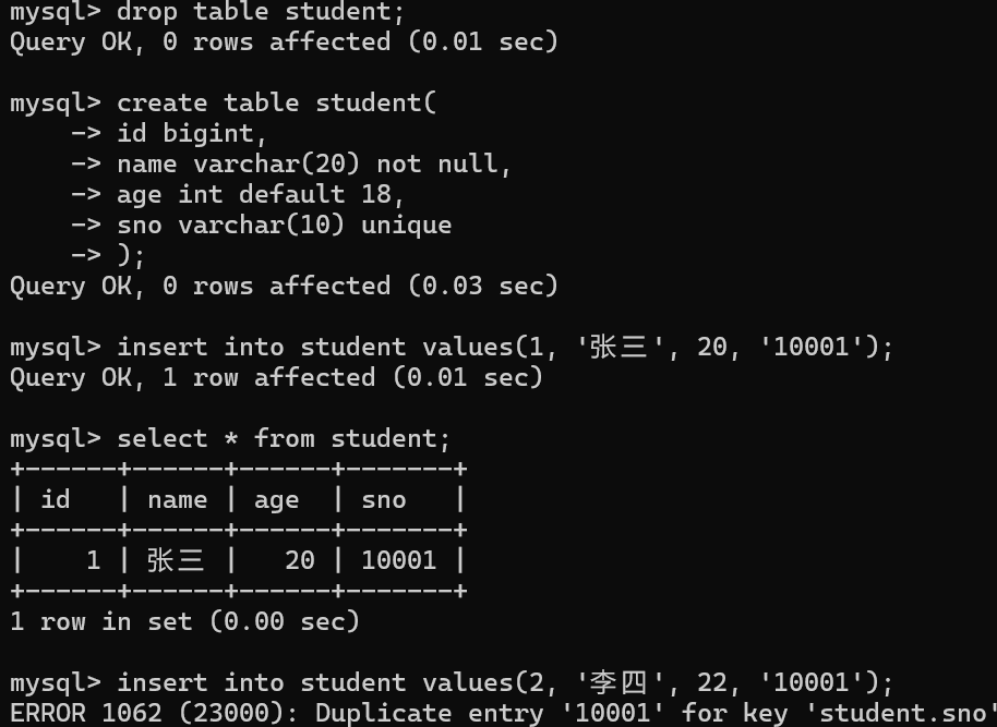 • 插入重复的学号时报错 ,唯一 约束生效。