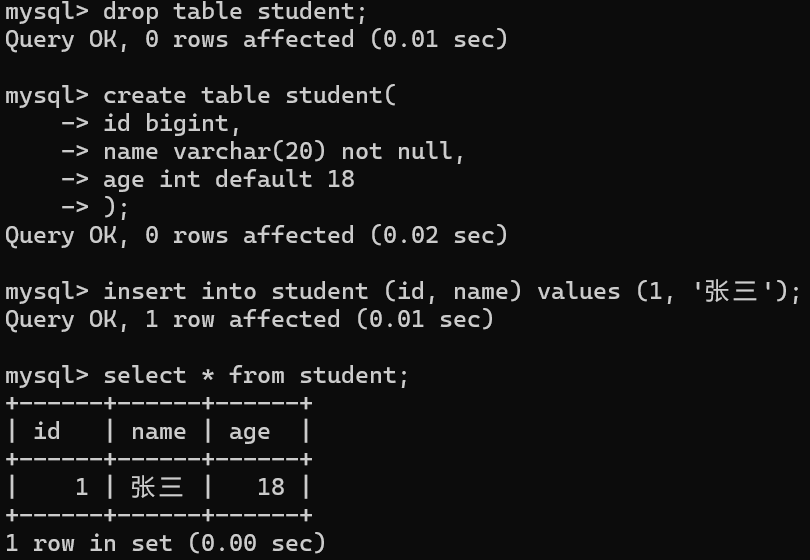 • 插入一条记录,不指定年龄的值时列使用了默认值 (若没有设置默认约束 时会为NULL )。