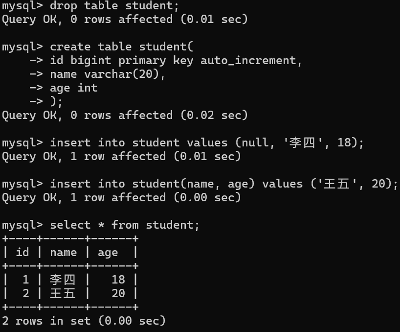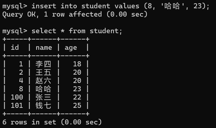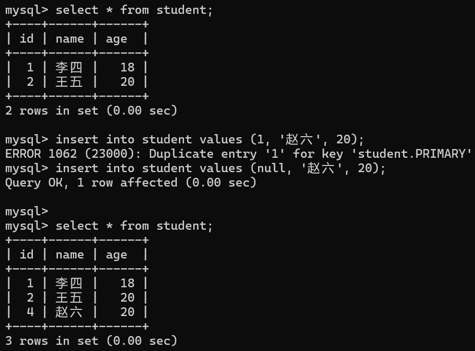 修改 id 后成功插入数据 ,查询后发现新记录 id 列的值为4。