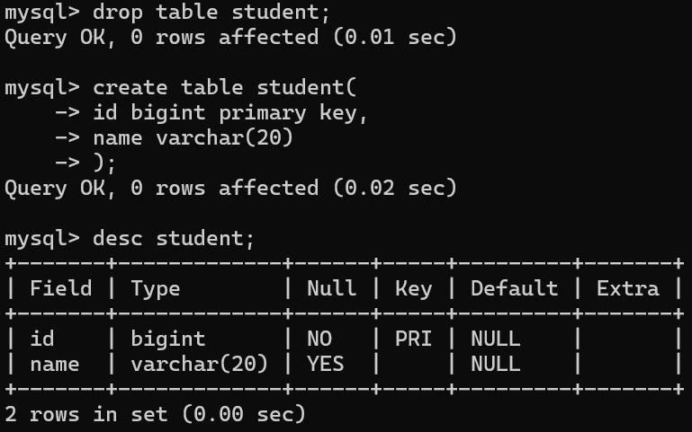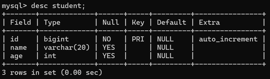 • 查看表结构, id列的 Key 属性值 为PRI ,表示 id 已被成功 设为主键。
