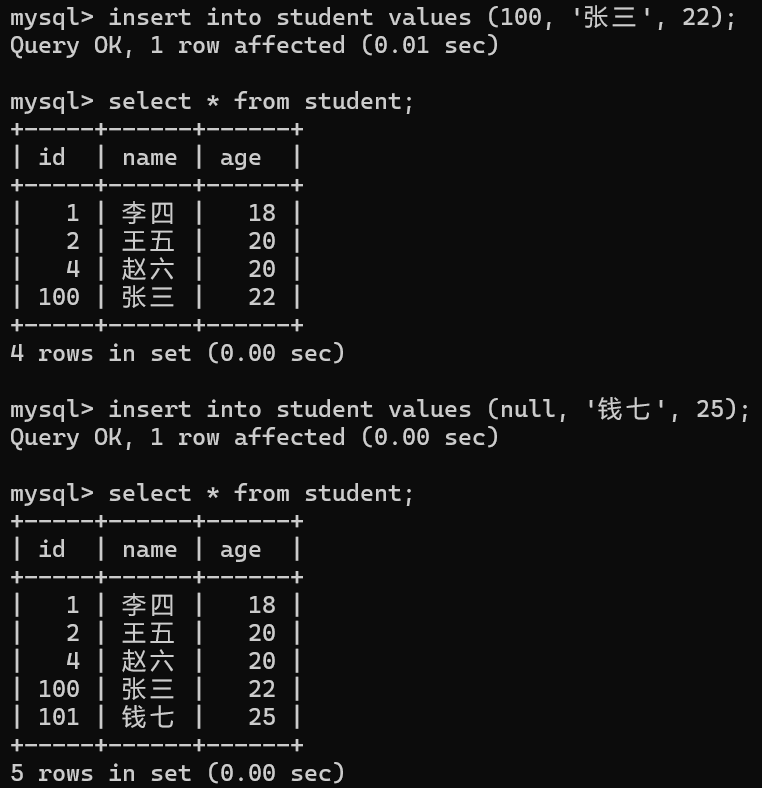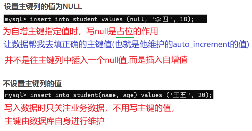• 插入数据时,设置主键列的值为NULL 或 不设置主键列的值(推荐) ,主键列的值都会自动生成。