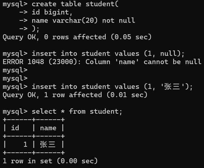 • 由于name列有非空约束,插入NULL值时报错。