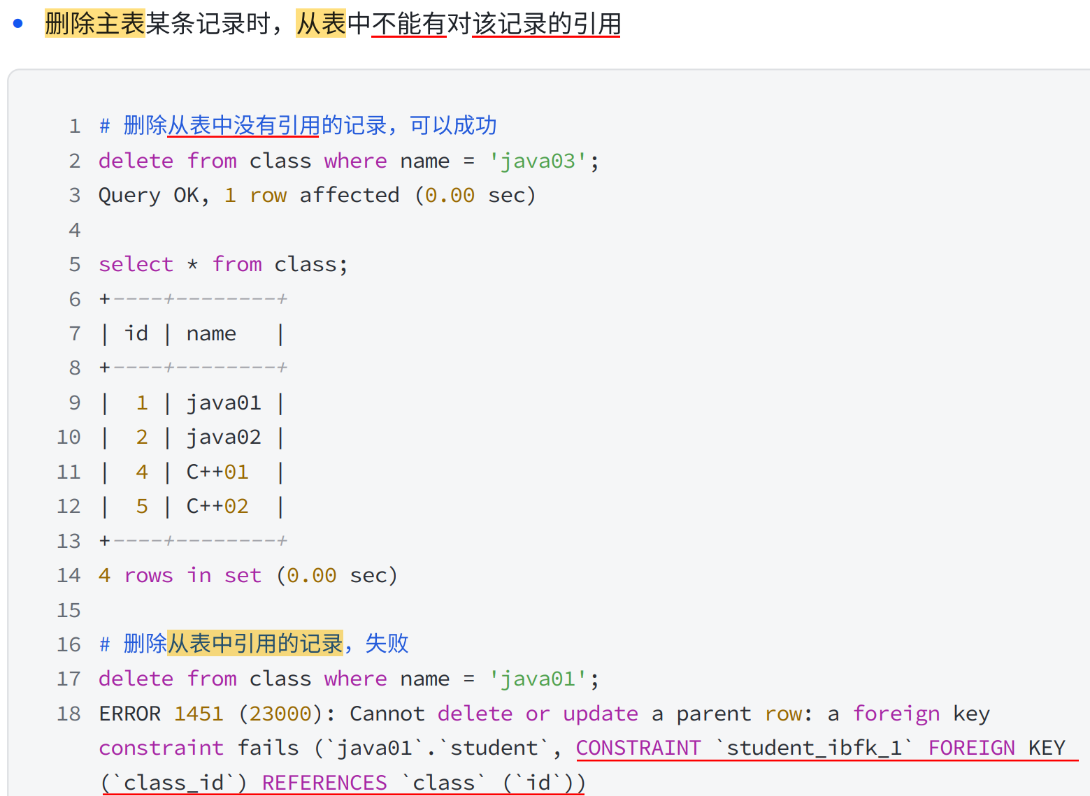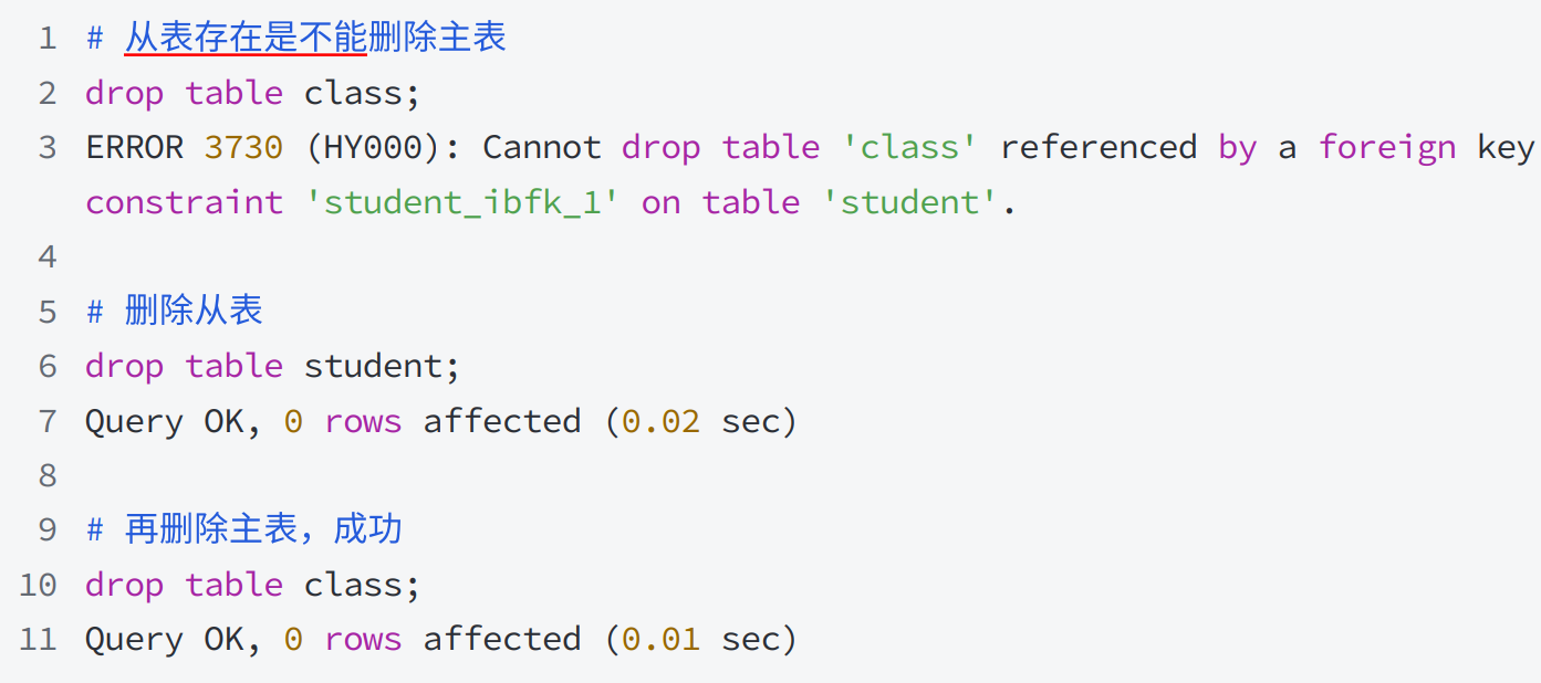 • 删除主表 前,请先处理依赖关系 ,可选择删除从表 或 解除所有外键约束或 清空从表数据。