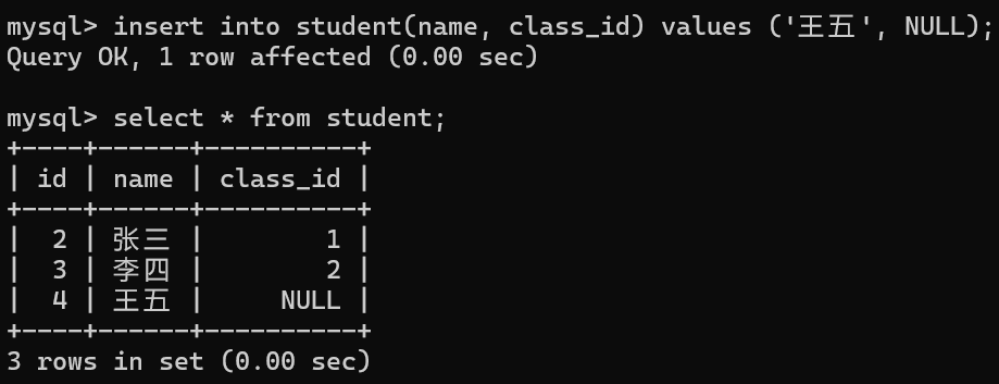 • 插入班级Id为NULL 的记录,可以成功 ,表示当前学生还没有分配班级。