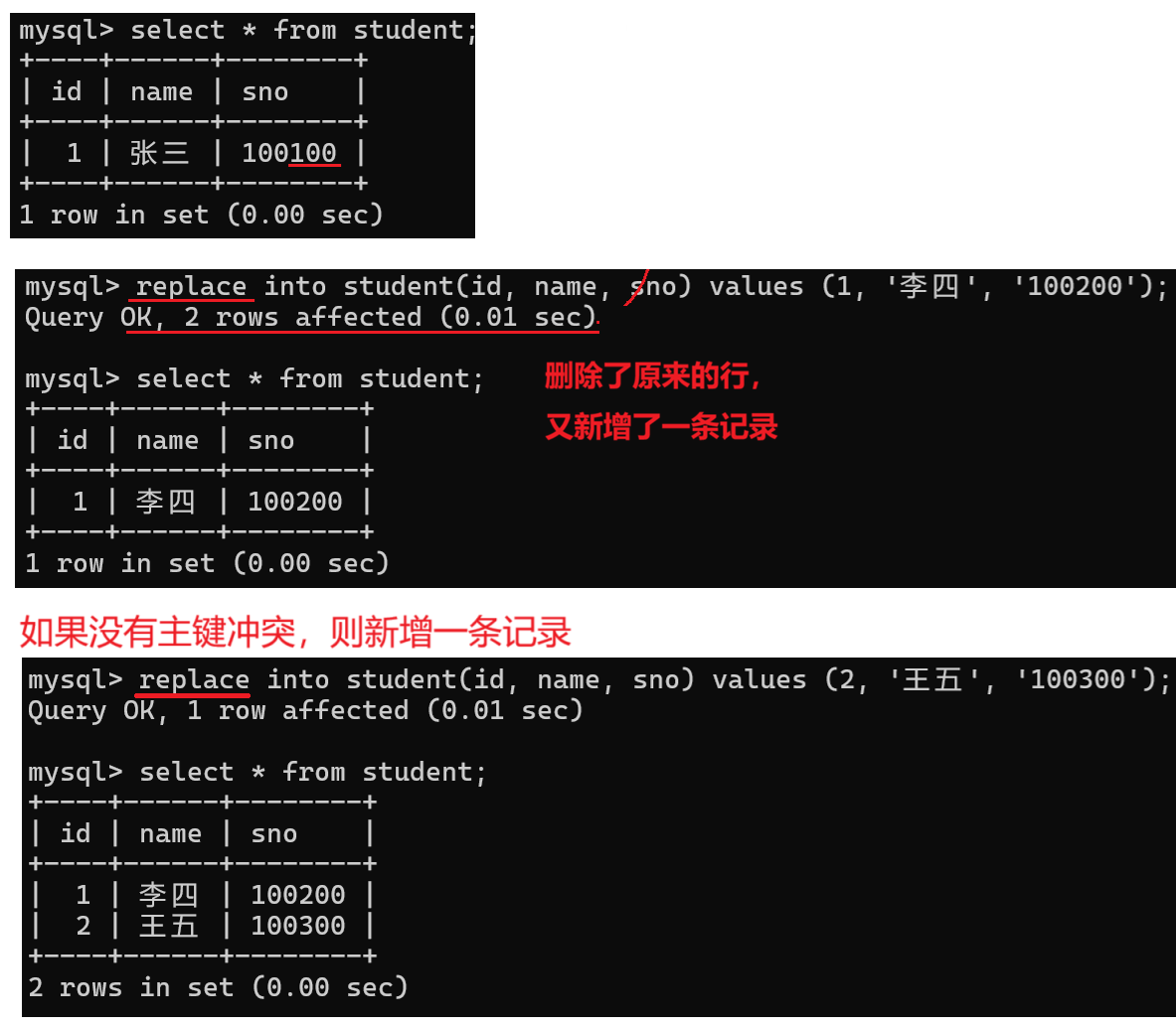• 替换 ,如果存在冲突 则替换,不存在冲突 则插入。