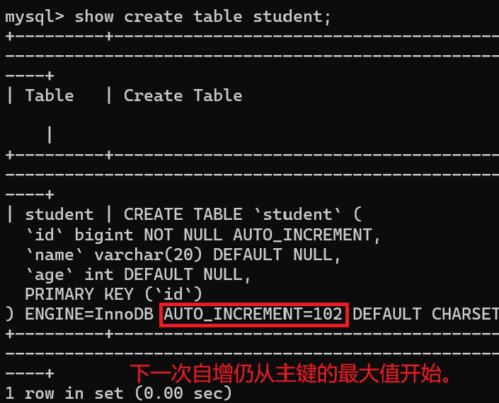 当然也可以手动指定中间的值 ,但是下一次自增仍从主键 的最大值开始。