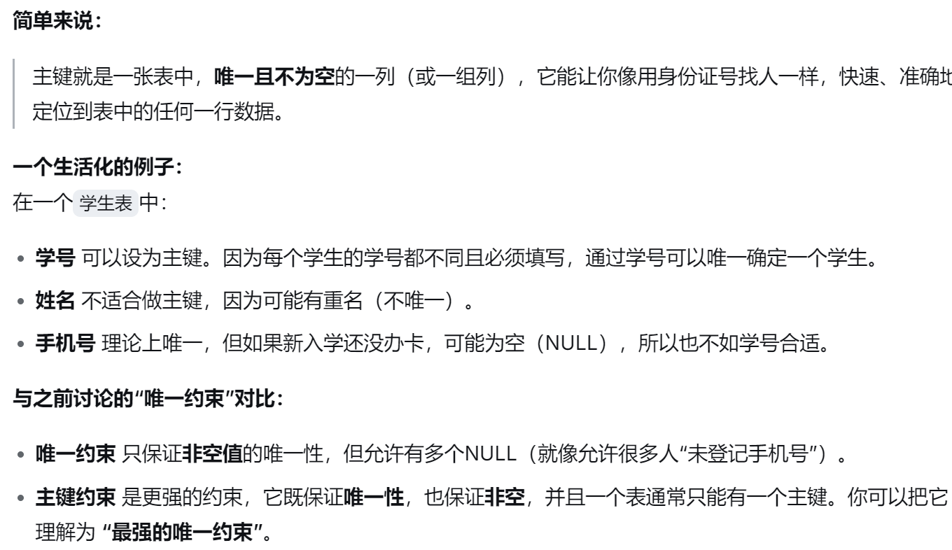 指定了唯一约束的列 ,该列的值在所有记录中不能重复 ,比如⼀个人的身份证号 ,学生的学号等。