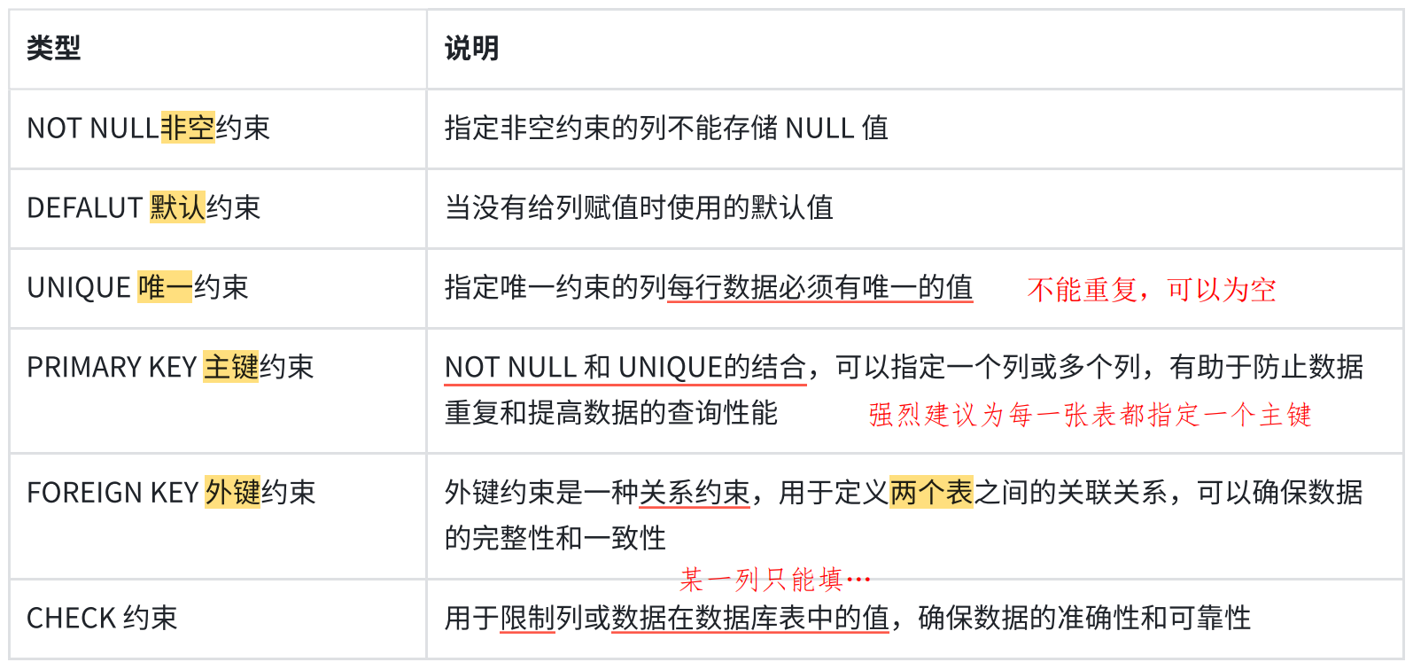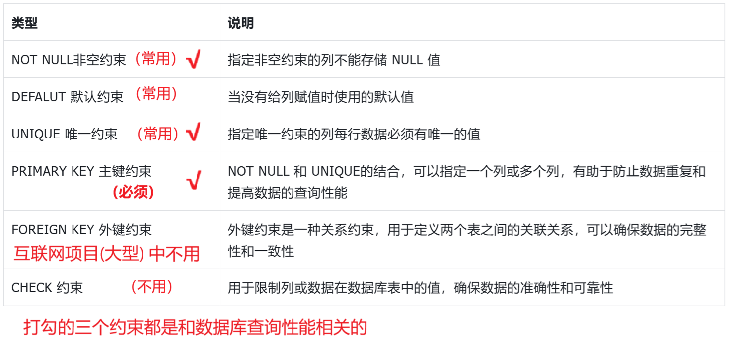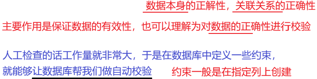 概念: 数据库约束是指对数据库表中的数据 所施加的规则或条件 ,用于确保数据的准确性和可靠性 。这些约束可以是基于数据类型、值范围、唯一性、非空等 规则,以确保数据的正确性和相容性。