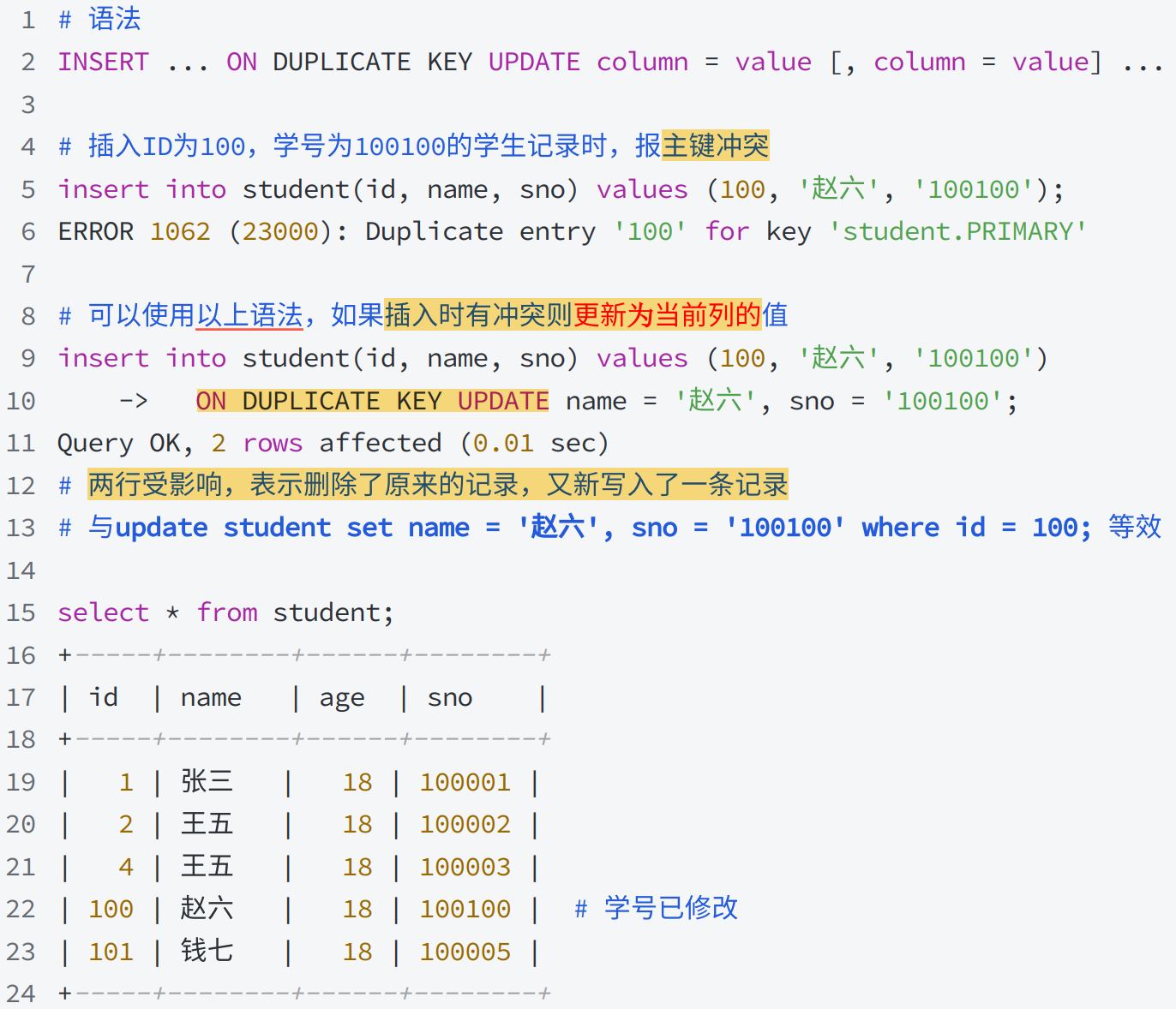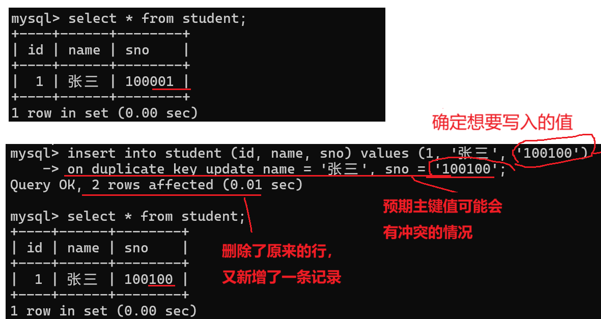 • 主键或唯一键 有冲突时 的更新操作
