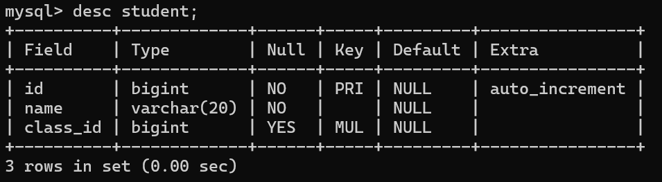 • 查看表结构,class_id列的Key 属性值 为 MUL ,表示该列已成功添加外键约束。
