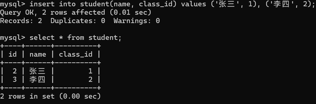 • 正常向从表 中插入 数据,班级编号在主表中存在,插入成功。