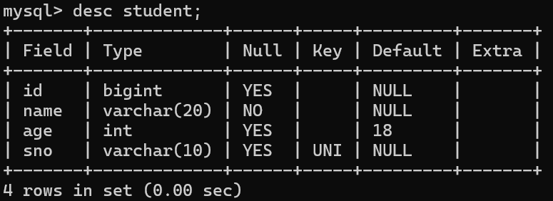 • 查看表结构 ,age****列 的 Default 属性值 为18。