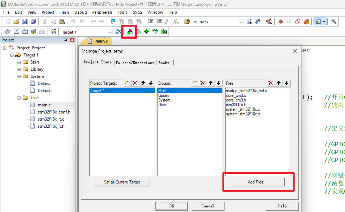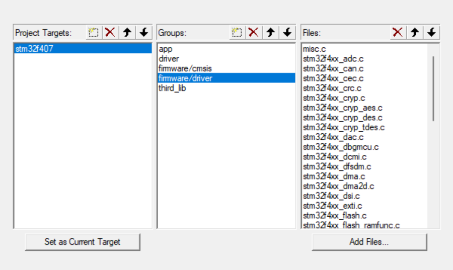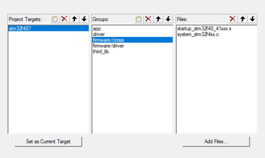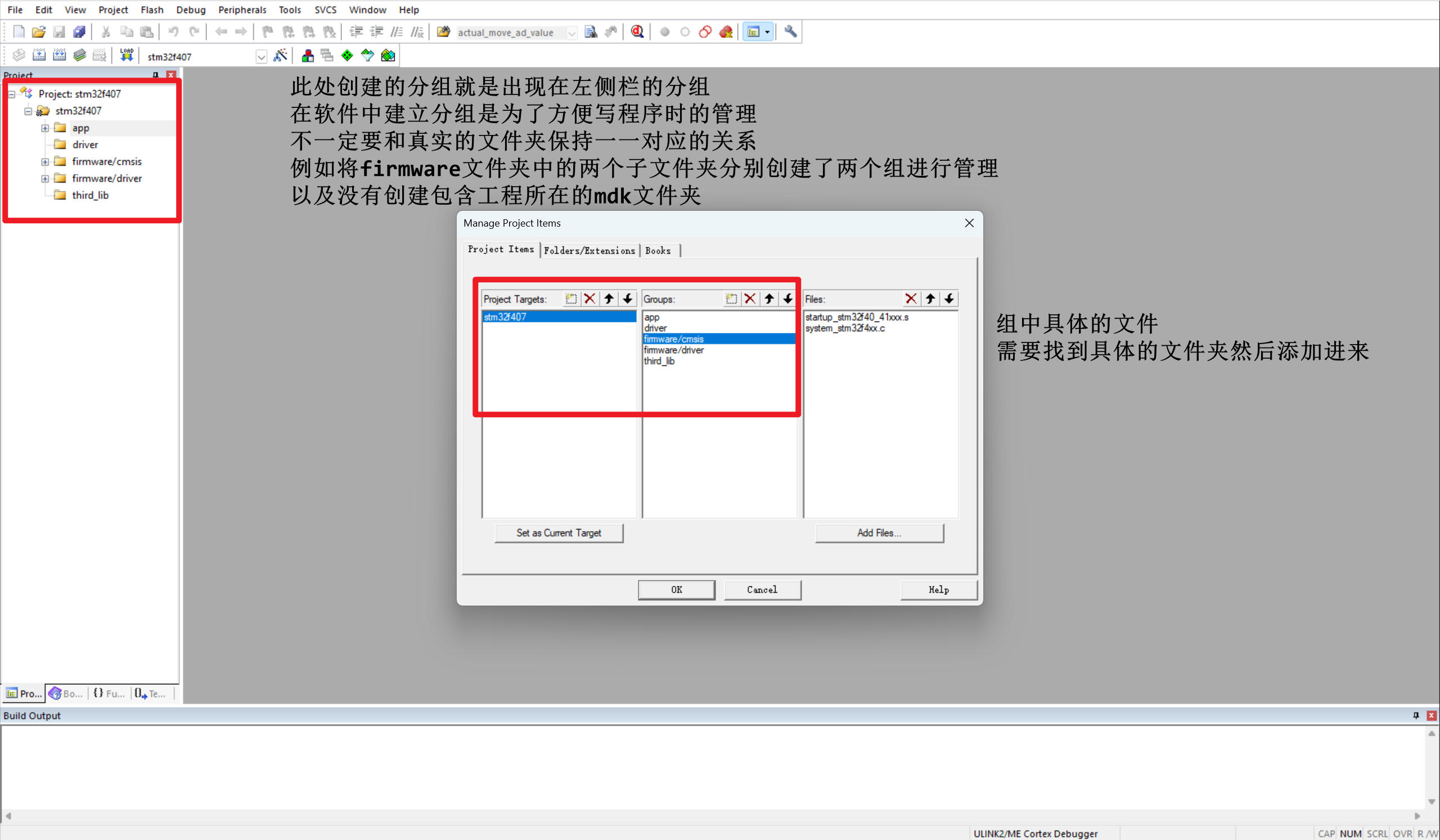 - 在keil中再次创建组件(建议将名称与使用到的文件夹的名称相同)并添加文件。包括芯片汇编相关的md.s文件,内核相关的cm3.c和cm4.h文件,芯片相关的.h文件,芯片系统相关的.c和.h文件,工程库相关的conf.h文件,中断相关的it.h文件