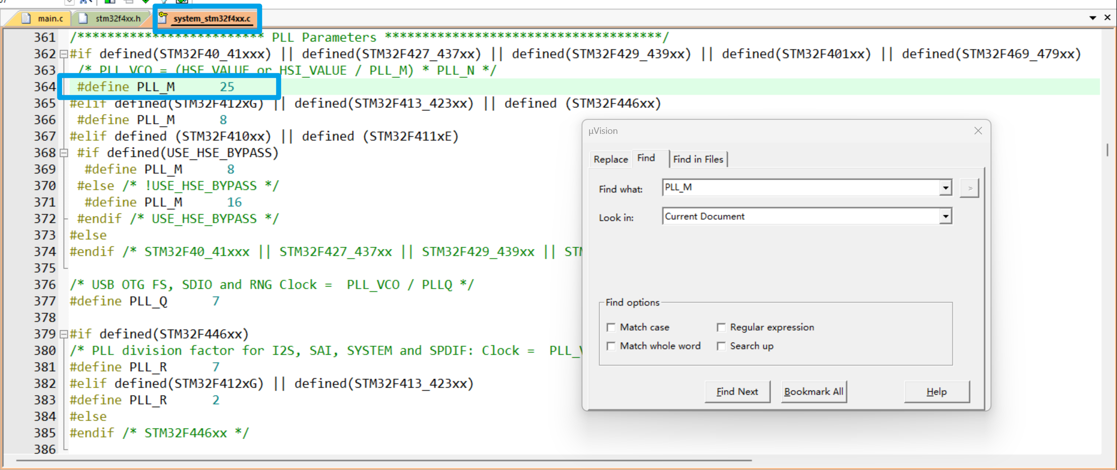 - 修改时钟(简记,目前还不清楚不修改的后果):因为官方F4例程使用的是25M的频率,国内买到的板子大多实际频率是8M,找到宏定义,在宏定义处进行修改,同时修改PLL_M的值