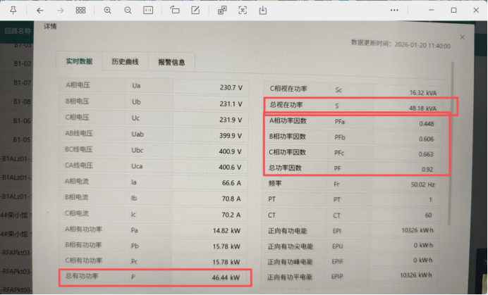 - 总功率因数异常的原因 :图中总功率因数(0.92)远高于各相功率因数(0.448~0.663),这是因为三相系统的总功率因数是 "总有功 / 总视在",而各相功率因数是 "各相有功 / 各相视在",谐波和三相不平衡会让两者表现出明显差异。