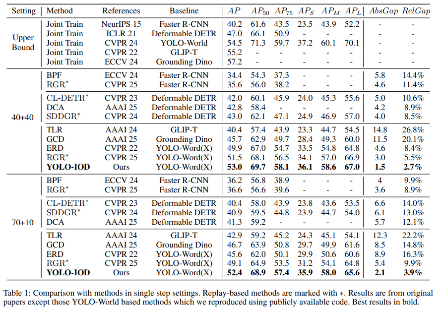单步增量设置下,YOLO-IOD 在 40+40 和 70+10 任务中分别达到 53.0% 和 52.4% 的 mAP,相对联合训练的差距降至 2.7% 和 3.9%,显著优于 BPF、CL-DETR 等方法。