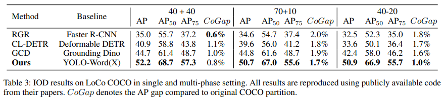 所有方法在 LoCo COCO 上 AP 均有 0.6%-2.0% 下降(验证数据泄露的影响),但 YOLO-IOD 仍保持优势,40+40、70+10、40-20 设置下 AP 分别超此前最佳方法 GCD 7.5、5.9、8.5 个百分点。