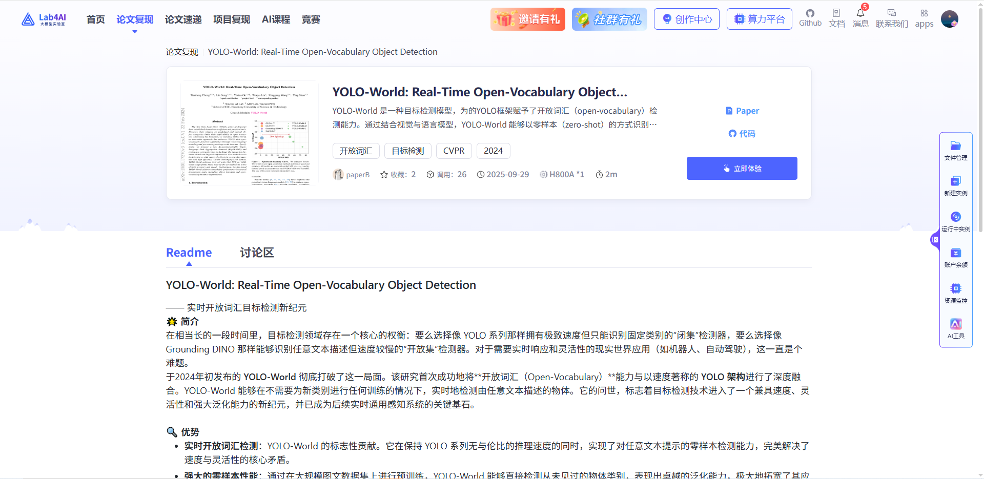 大模型实验室 Lab4AI 已经内置好了 YOLO-World 论文的复现所需的环境。所以,您可以登录大模型实验室 Lab4AI 来直接使用该环境进行体验本论文的训练过程。