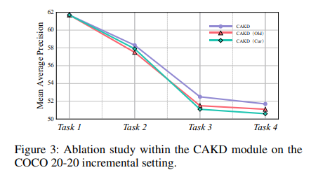 CAKD 双教师架构最优:早期阶段"仅当前教师"适配新类别更快,后期"仅旧教师"保留知识更优,双教师融合始终表现最佳。