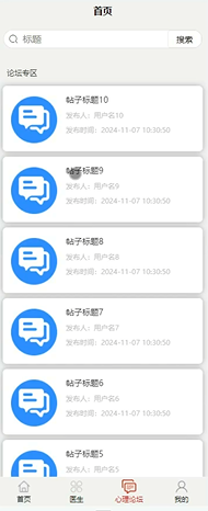智能化内容推荐与互动设计:首页内容采用协同推荐算法,精准推送心理咨询服务、案例及医生信息;搭建心理论坛模块,支持发帖、评论、点赞等互动功能,打破用户心理隔阂,营造互助交流氛围。