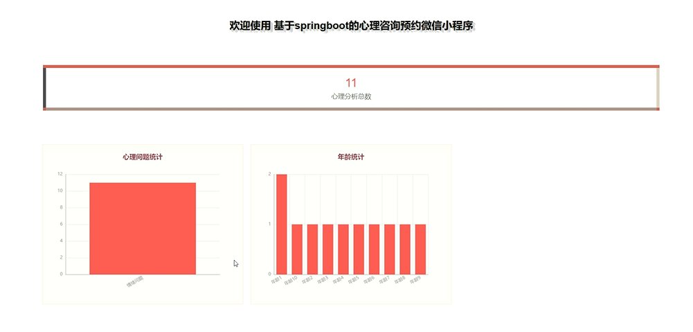 数据化管理与监管:管理员端通过可视化图表实时掌握平台运行数据(用户心理问题、年龄分布等),便于精准优化服务;同时对咨询预约、帖子内容、用户信息进行全流程管控,保障平台数据安全与服务质量。