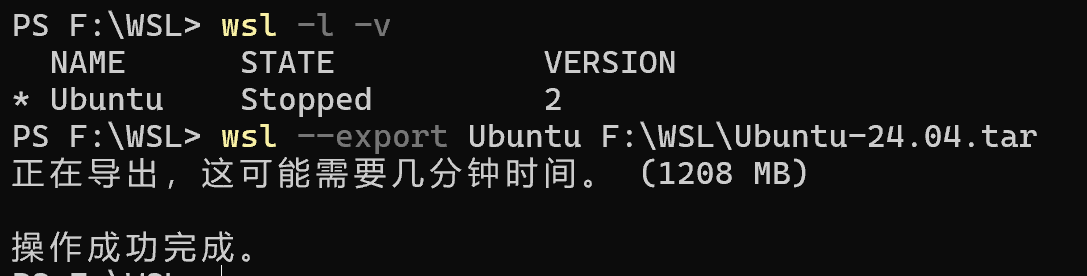 wsl --export Ubuntu F:\WSL\Ubuntu-24.04.tar