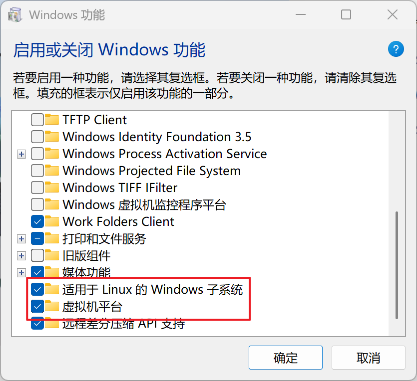 任务栏搜索功能,打开 启用或关闭Windows功能 界面,勾选以下两项,然后点击 确定。