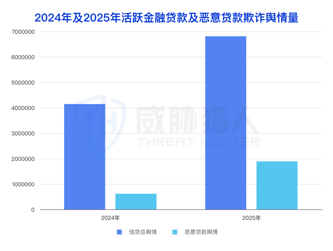 威胁猎人研究分析显示,2025年金融贷款领域恶意欺诈风险、职业背债风险相关舆情量,较2024年同比分别激增200%、168%,风险扩散态势显著。