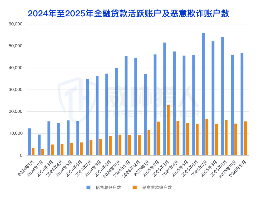 2025年威胁猎人监控捕获活跃贷款服务账户33万个,其中提供恶意贷款服务的欺诈账户(信贷黑中介/黑产)10万个,占总量30%,较2024年增长135%。