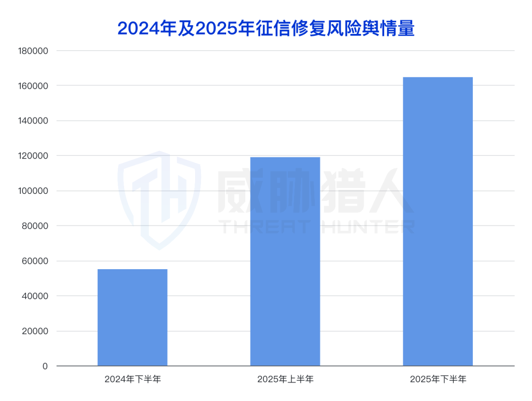 2025年征信修复风险舆情量持续增长,2025年上半年征信修复风险舆情量较2024年下半年环比增长116%,2025年下半年征信修复风险舆情量较2025年上半年增长38%,2025年下半年征信修复风险舆情量较2024年下半年增长199%。