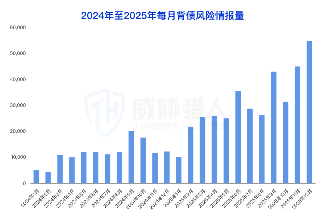 2025年威胁猎人监控捕获职业背债风险舆情量达37万条,其中,下半年舆情量较上半年增长 59%,整体舆情量较 2024 年同比增长 168%。