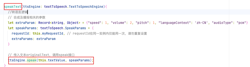 那我们找到这个方法后 才发现要在setListenner方法后才可以,调用这个方法去播放,那就先封装好这个方法,把需要转化的文本我们作为自定义函数的参数,调用的时候传进去,也可以做一个页面的状态变量放进去,避免忘了传参数引发报错,