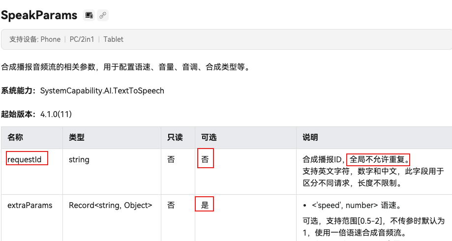 这里有个播放参数,其中有个必选参数requestId,我在调试时 ,先给了一个固定的字符串,确保参数有效,能让我首次发出声音,后来呢,我们想在这个页面进行多次的更换文本播放,就做了动态的id传入,因为他是不能重复的,更换文本后想要再 次播放就要切换id。