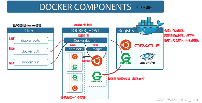 - Docker daemon :Docker引擎的核心组件,运行在宿主机上的后台线程,它负责管理和控制Docker所有的核心功能,也称为"守护线程"。