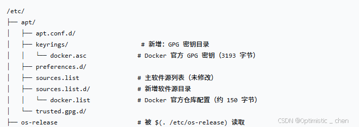 ca-certificates:CA根证书,用于HTTPS连接验证curl:命令行工具,用于从网络下载文件/etc/apt/keyrings:这是 Ubuntu 存储 GPG 密钥的新标准位置https://download.docker.com/linux/ubuntu/gpg:官方密钥的URL-o /etc/apt/keyrings/docker.asc:保存密钥到指定文件(.asc格式)chmod a+r:给所有 ( a )用户添加读取 ( r ) 权限,确保apt包管理器能读取这个密钥文件deb:表示二进制包仓库$(dpkg --print-architecture):动态获取当前架构signed-by=/etc/apt/keyrings/docker.asc:指定验证软件包签名的GPG密钥文件. /etc/os-release:加载系统版本信息文件$VERSION_CODENAME:提取Ubuntu版本号,自动适应当前Ubuntu版本