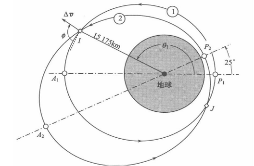 我们的卫星正运行在一条 8000∼16000 km8000 \sim 16000 \text{ km}8000∼16000 km 的轨道(轨道 1)上。现在的任务是:转移到一条近地点 7000 km7000 \text{ km}7000 km、远地点 21000 km21000 \text{ km}21000 km 的新轨道(轨道 2),并且这条新轨道的轴线要比原来逆时针旋转 25∘25^\circ25∘。