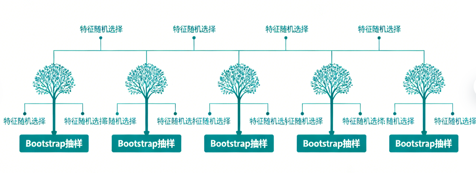 样本随机(Bootstrap 抽样):从原始训练集中,通过有放回抽样(Bootstrap)的方式,为每一棵基决策树生成独立的训练样本集。假设原始样本量为N,每次抽样均从N个样本中随机选择N个(允许重复),最终约有37%的样本不会出现在单棵树的训练集中,这部分样本被称为"袋外样本(OOB)",可用于无额外验证集的模型评估。