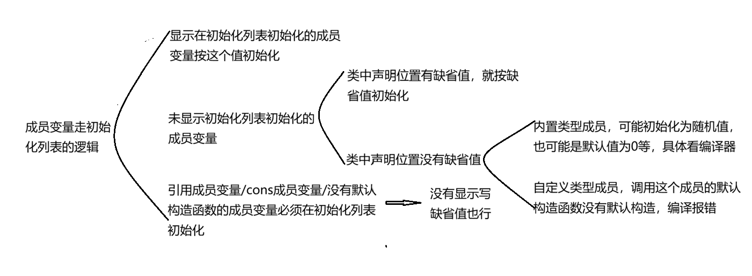 我们不写,编译器默认⽣成的构造,对内置类型成员变量的初始化没有要求,也就是说是是否初始化是不确定的,看编译器。对于⾃定义类型成员变量,要求调⽤这个成员变量的默认构造函数初始化。如果这个成员变量,没有默认构造函数,那么就会报错,我们要初始化这个成员变量,需要⽤初始化列表才能解决,初始化列表。