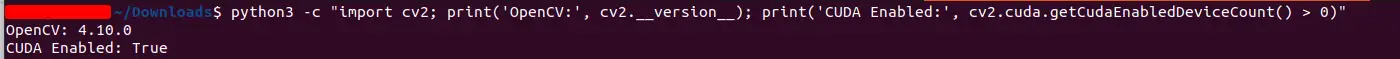 python3 -c "import cv2; print('OpenCV:', cv2.__version__); print('CUDA Enabled:', cv2.cuda.getCudaEnabledDeviceCount() > 0)"