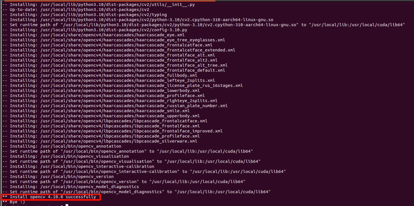 在 AGX Orin 上编译约需 30-50 分钟,在 NX 上大概需要数小时。看到 ** Install opencv 4.10.0 successfully 即表示成功。