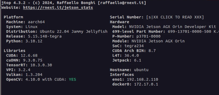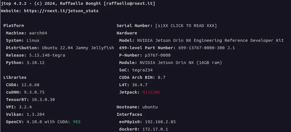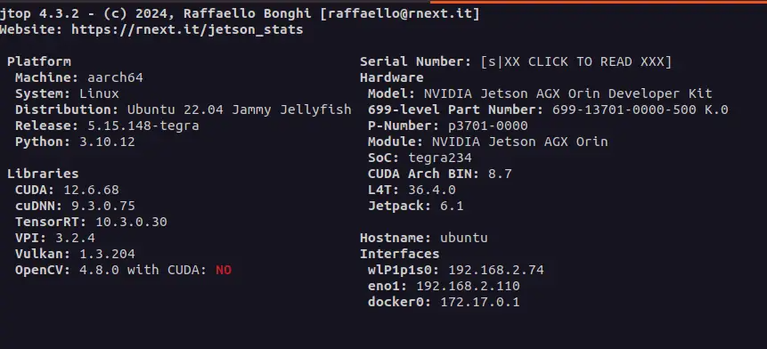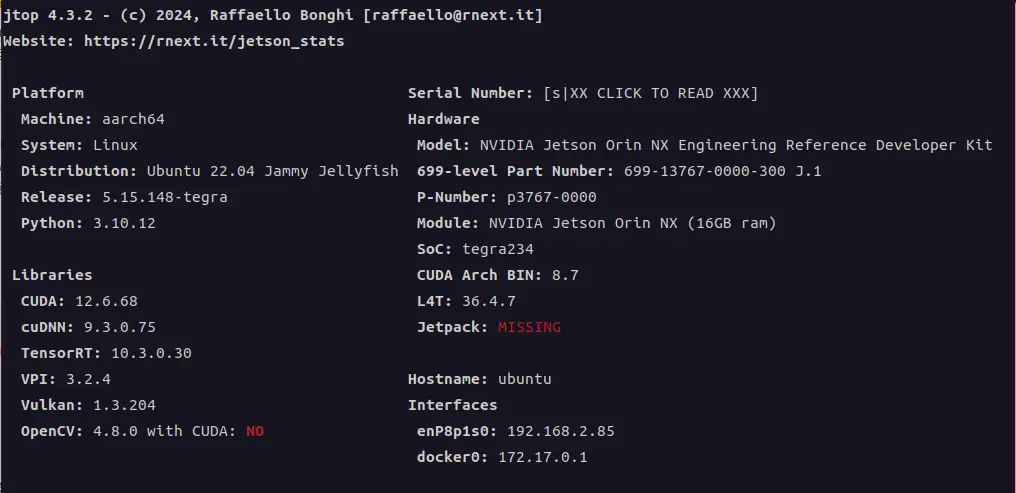 如果你安装了 jetson-stats 工具,可以运行 jtop,在 INFO 页面底部查看 OpenCV 状态,应显示为 4.10.0 with CUDA: YES。