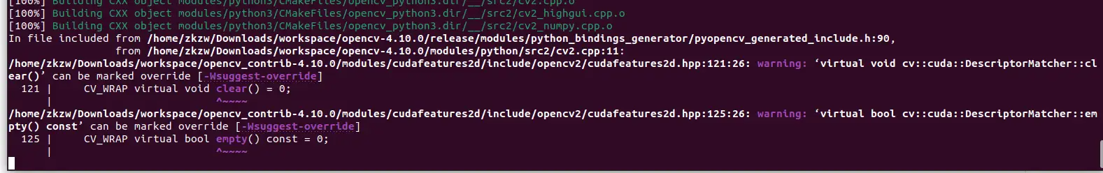 原因 : 这不是报错! 这是 GCC 编译器对代码风格的建议(Suggest Override)。它提示开发者某些虚函数可以加上 override 关键字以符合现代 C++ 规范。 解决方法 : 无视它,耐心等待。 只要没有出现 Error 字样,且脚本最终打印了 ** Install opencv 4.10.0 successfully,就说明编译是成功的。这些警告不会影响 OpenCV 的功能和性能。