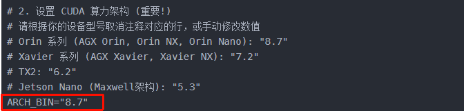 | Jetson AGX Orin | Ampere | "8.7" | 脚本默认值 |