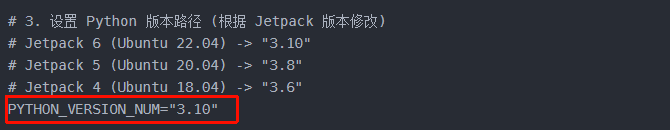 | Jetpack 版本 | Ubuntu 系统 | 默认 Python | PYTHON_VERSION_NUM 修改值 |